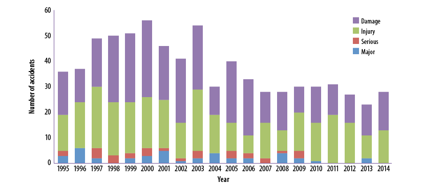 U.S. Federal Aviation Regulations Part 121 carriers did not suffer any major or serious accidents in 2014, according to preliminary data released in early August by the National Transportation Safety Board (NTSB). Last year represents the third year in the past four that U.S. Part 121 airlines have not suffered any major accidents and the fifth year in a row without any serious accidents, according to NTSB data. There were, however, 13 Part 121 accidents with injury in 2014 and 15 accidents with damage (Figure 1).